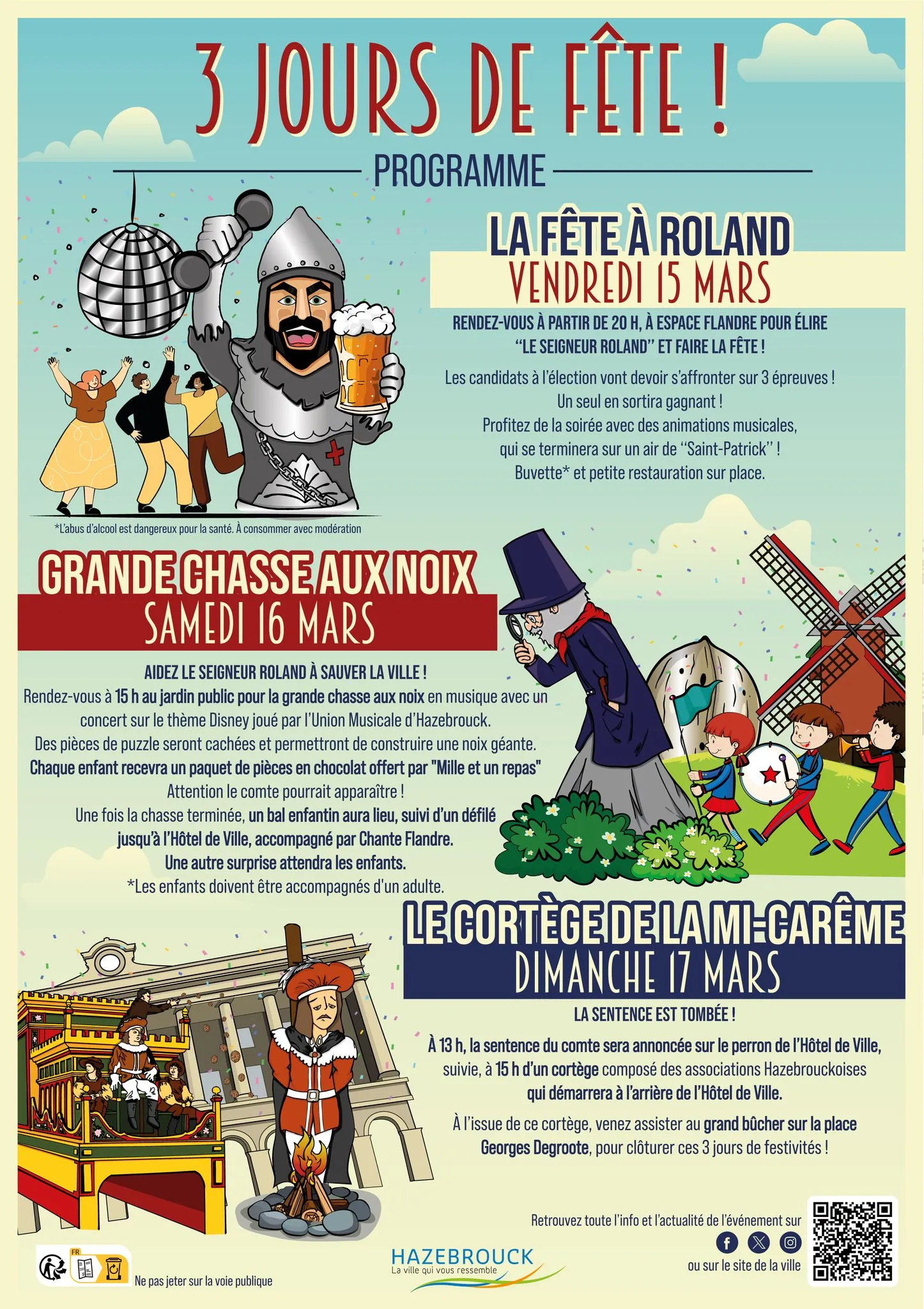 Les festivités auront lieu durant trois jours, du 15 au 17 avec un programme chargé. Rendez-vous dès le vendredi à Espace Flandre pour l’élection du seigneur Rolland. Le samedi, une grande chasse aux noix est organisée pour les enfants et enfin, le dimanche, un cortège défilera dans les rues de la Ville.
