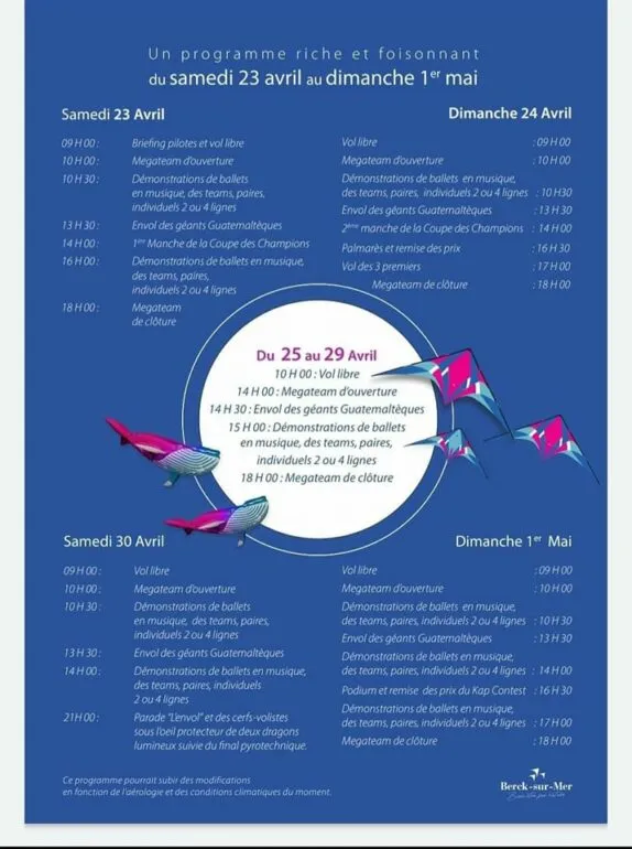 Et ce sera même le cas durant neuf jours. Ce samedi, c’est le début des 35ème rencontres internationales de cerfs-volants à Berck-sur-Mer. Neuf jours d’animations, neuf jours avec les plus grands champions, les plus beaux cerfs-volants du Monde. Début du festival ce samedi, avec des animations jusque dimanche prochain, le 1er mai.