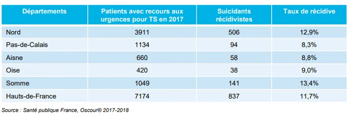 Taux de récidive de tentative de suicide parmi les suicidants passés aux urgences du 1er janvier 2017 au 31 décembre 2017, selon le département de résidence, Hauts-de-France