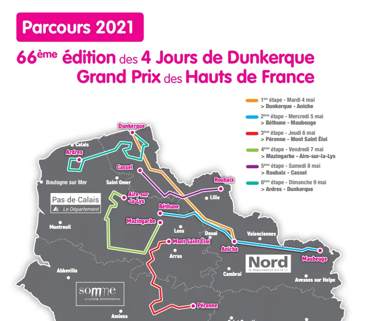 - 4 mai 2021, étape 1 : Dunkerque (Place Jean Bart) - Aniche (59) pour 171 km marqués par des passages par le Mont des Cats et le Mont Noir.