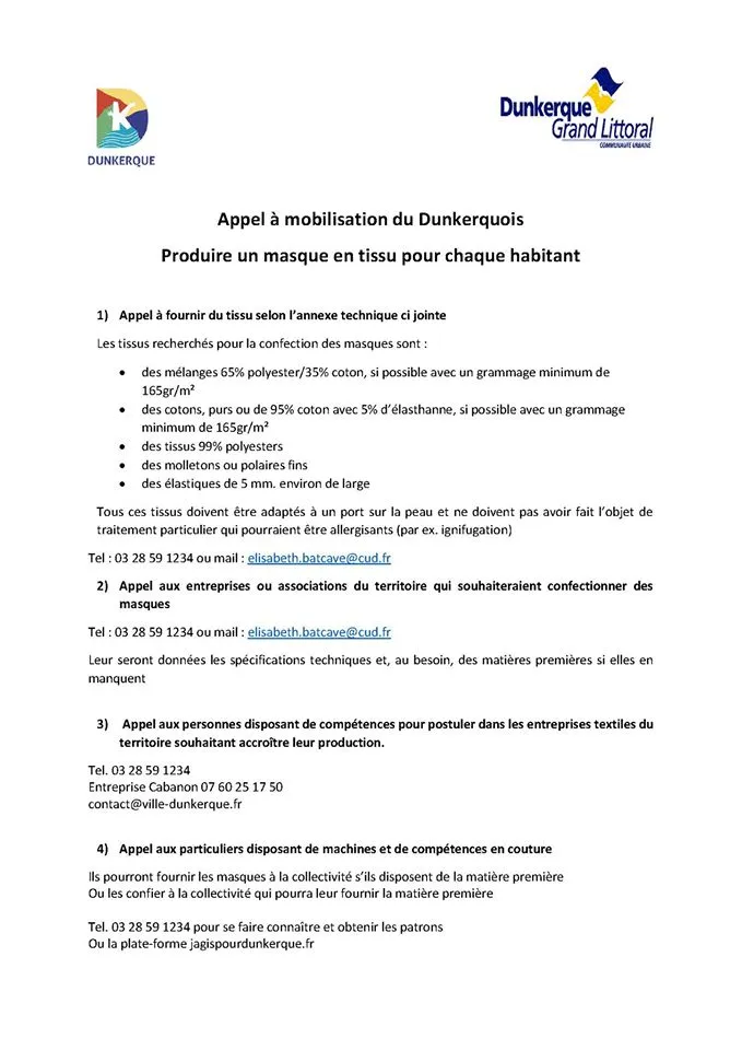 Le Président de la CUD veut offrir un masque de protection à tous les habitants de l’agglomération dunkerquoise. Pour cela, Patrice Vergriete lance un nouvel appel à la solidarité à destination des entreprises locales et des bénévoles. Il faut aussi des dons de tissus et d’élastiques pour relever le défi de confectionner 200.000 masques en tissus, lavables et réutilisables. Pour vous engager, il faut appeler au plus vite le 03 28 59 12 34. Une très forte participation permettrait de fabriquer ces masques en 3 ou 4 semaines.