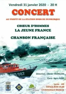 Ce vendredi, le chœur d'hommes de la Jeune France est en concert à Coudekerque-Branche. Un spectacle au profit de la SNSM. Un concert de chansons françaises et quelques chansons de marins pour aider l'antenne dunkerquoise des sauveteurs en mer. C'est ce vendredi à 20h a l'espace Jean Vilar, et l'entrée est de 10 euros.
