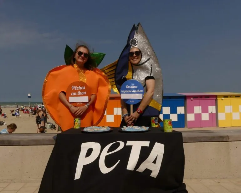 Une pêche et un thon géants sur la digue de Malo, à Dunkerque, ce jeudi après-midi. Bon on vous rassure, ils n’étaient pas méchants, mais juste en colère. Ces deux bénévoles de l’association PETA, déguisés donc, ont distribué aux passants une spécialité du Nord... pour défendre les animaux. Ils ont offert des pêches au thon véganes pour promouvoir une alimentation respectueuse des poissons et de la mer.