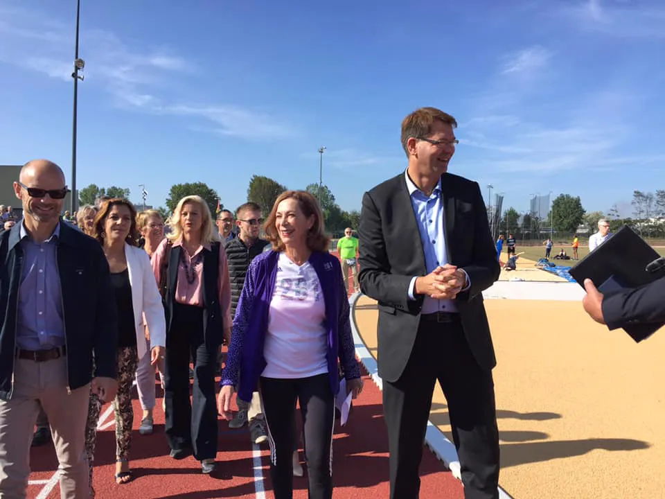 Ce samedi 14 septembre, la ville de Dunkerque inaugurait son nouveau stade d’athlétisme en présence de Katherine Switzer. La ville de Dunkerque a décidé de donner pour nom au stade celui de la célèbre marathonienne américaine, connue pour être la première femme à avoir couru le marathon de Boston en 1967.