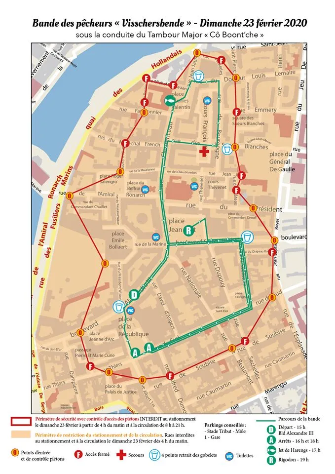 Comme l'an dernier, la bande de Dunkerque s'élancera du boulevard Alexandre 3. Elle s'arrêtera sous les fenêtres de l'hôtel de ville de Dunkerque, pour le traditionnel jet de hareng. Découvrez le parcours ci dessous :