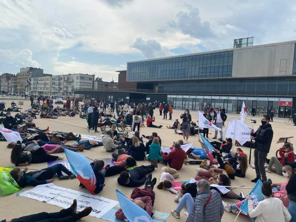 La manifestation s'est terminée par un "die in" place du centenaire en face du Kursaal. Les participants allongés sur le sol pour simuler "l'extinction de la planète".