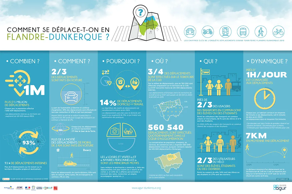 "Comment se déplace-t-on en Flandre Dunkerque" ? L’AGUR vous apporte la réponse avec les résultats d’une enquête menée auprès des ménages de notre territoire en 2015. Sans grande surprise, la voiture est encore largement en tête. Elle est privilégiée même sur les courtes distances. Le bus n’est plébiscité qu’à 5 % et le vélo, seulement 2 %. Des habitudes qui doivent changer, évoluer… Les chiffres de cette enquête seront d’ailleurs une aide à la décision pour les élus qui préparent la mobilité de demain. D’autres chiffres seront dévoilés sur le site internet de l’AGUR.