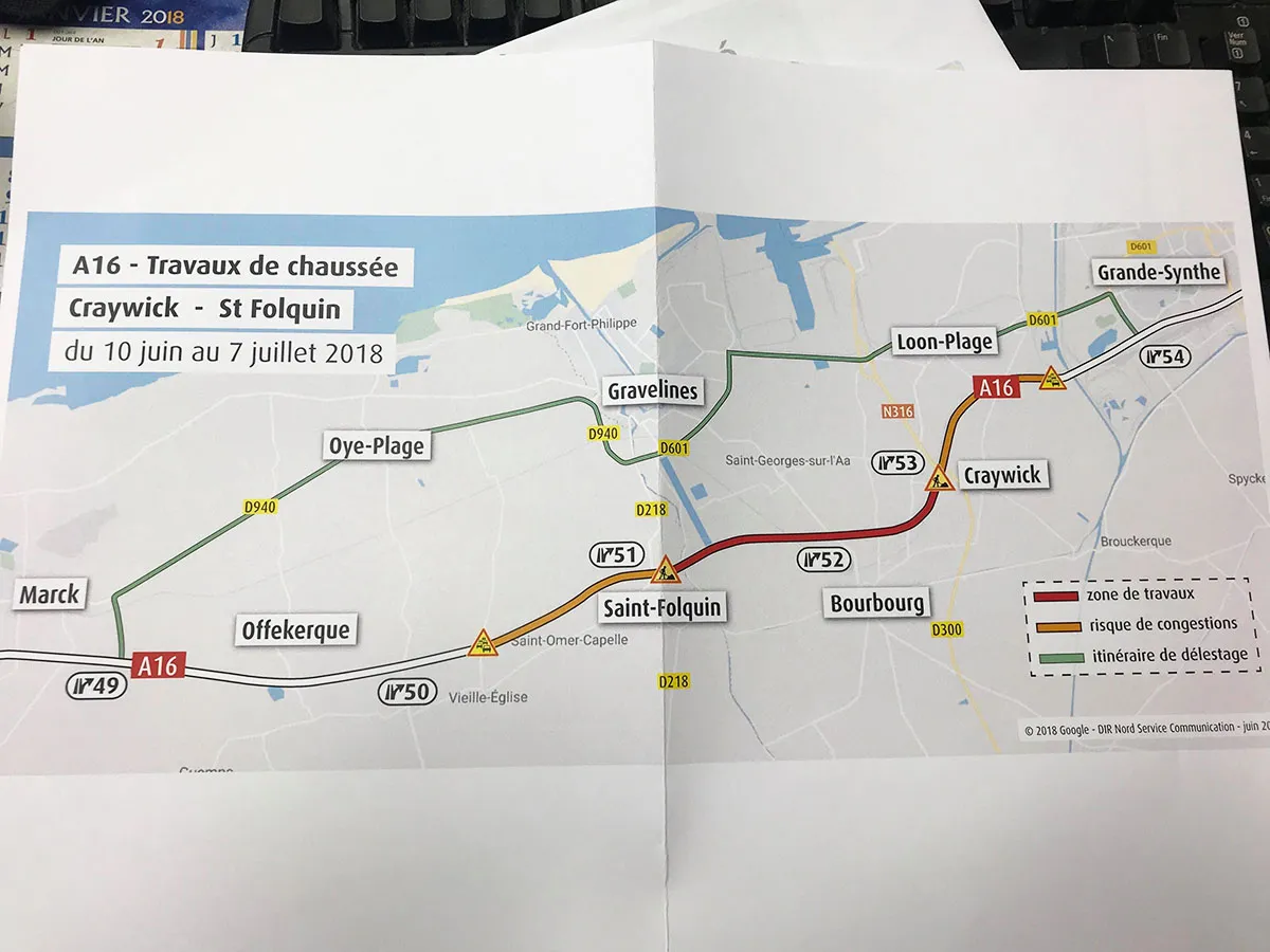 Du 24 juin au 30, les deux échangeurs de Loon-Plage et de Bourbourg / Gravelines / Saint Georges, les 52 et 53, seront totalement fermés et vous roulerez sur une voie avec un basculement de chaussée.