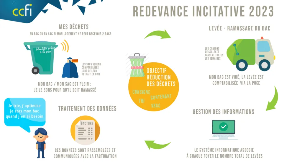 Courant 2022, chaque foyer recevra un bac pour ses ordures ménagères et un bac pour ses déchets recyclables. Ils seront équipés d’une puce, ce qui permettra de facturer le service à la levée. Le but : permettre à chacun de payer au plus juste, selon sa propre production de déchet. Actuellement, un habitant de la CCFI produit en moyenne 737 kg de déchets par an.