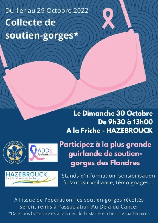 Les Ladies’ Circle 49 Hazebrouck se mobilisent avec une grande collecte de soutien-gorge. Le but, réaliser la plus grande guirlande de soutien-gorge de Flandres. Le record de 450 mètres de l'année dernière est à battre. Ce dimanche, les membres de l’association déploieront la guirlande au niveau de la friche à partir de 9h30. De nombreux stands et animations auront lieu, ce sera également l’occasion d’évoquer l’importance des dépistages.