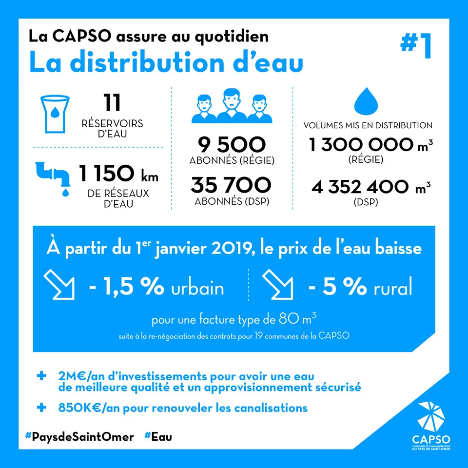 Vous allez peut-être voir votre facture d’eau baisser en 2019 ! Deux nouvelles délégations de service public EAU ont été signées : l’une entre la CAPSO et Suez, et l’autre entre la CAPSO et la Société des Eaux de Saint-Omer. Au total, 19 communes sont concernées, 10 en territoire urbain et 9 communes rurales situées vers le nord du territoire. Pour les usagers, ça va se traduire notamment par une baisse sur leur facture : 5% pour les communes rurales et 1,5% pour les communes urbaines. Ces nouvelles délégations sont signées pour 8 ans.