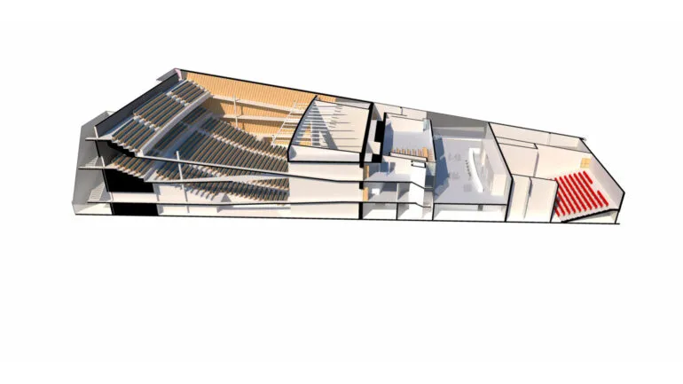 A gauche, la grande salle. Au centre, les salles de séminaire et le bar. A droite, la petite salle (photo: Clé Millet Architectes)