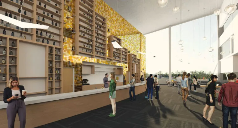 A l'étage, un bar accueillera les spectateurs. De grandes baies vitrées offriront une vue sur le port et la ville (photo: Clé Millet Architectes)