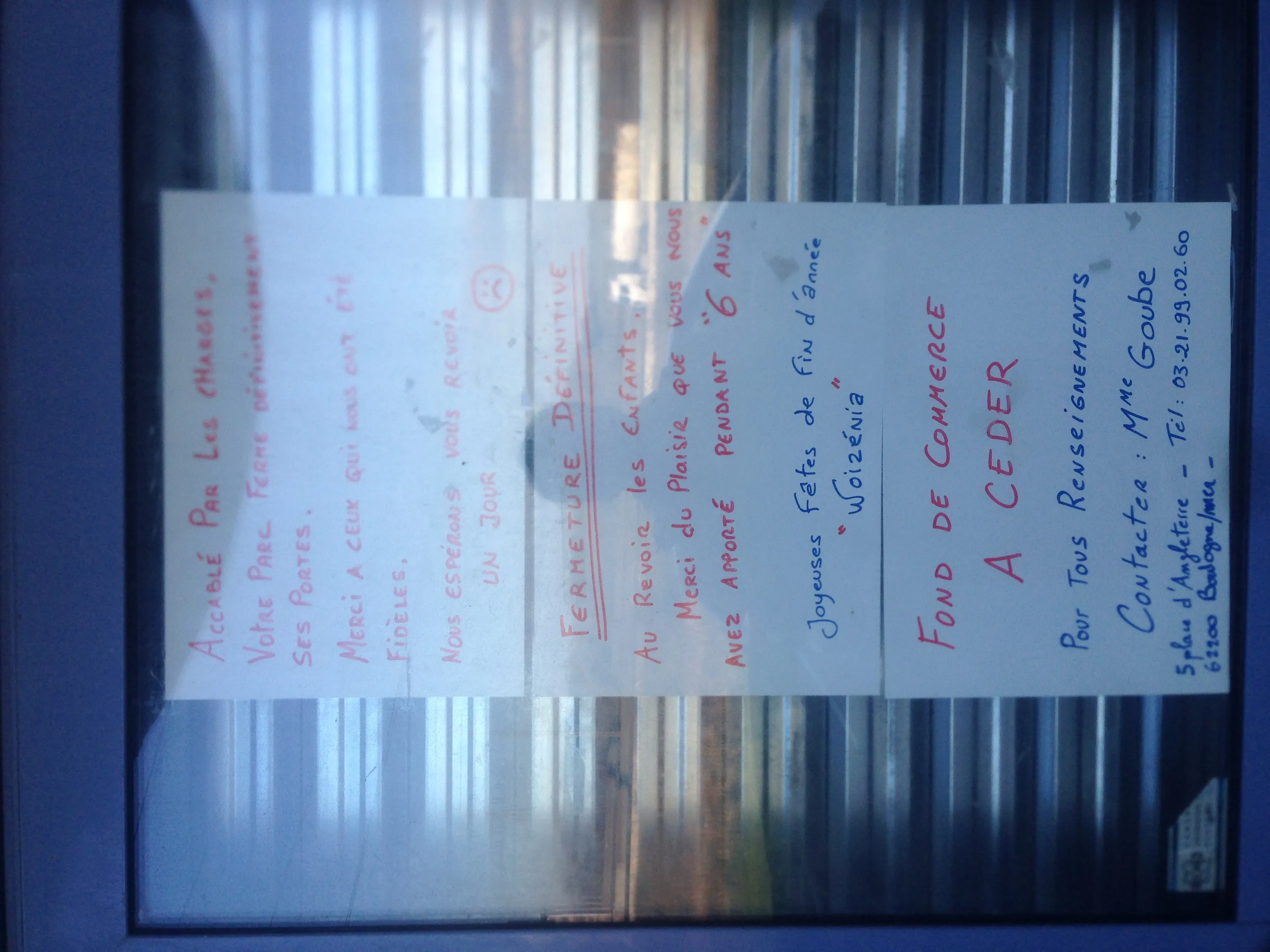 "Accablé par les charges, votre parc ferme définitivement ses portes. Merci à ceux qui nous ont été fidèles. Nous espérons vous revoir un jour. FERMETURE DÉFINITIVE. Au revoir les enfants. Merci du plaisir que vous nous avez apporté pendant 6 ans. Joyeuses fêtes de fin d'année"
