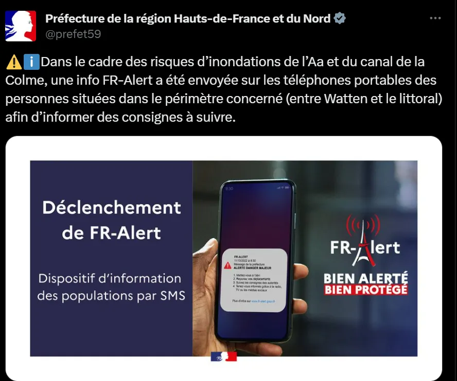 Ces dernières minutes, la prefecture du Nord a elle aussi décidé de déclencher l'alerte. Les habitants des communes à proximité de l'Aa et de la Colme ont ainsi eux aussi reçu ce message.