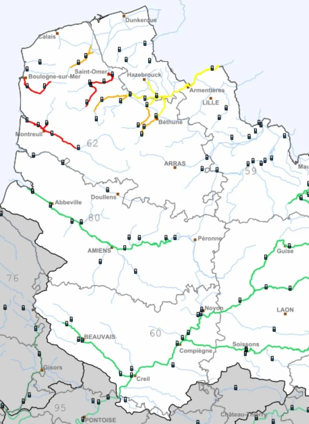 Le Pas-de-Calais toujours sous des trombes d’eau… Avec les averses qui continuent de tomber, le département reste sous très haute surveillance. L’Aa, la Liane sont repassées en alerte rouge ce jeudi matin. Vers 10h ce jeudi, la Canche a aussi basculé en alerte rouge. La Hem est en "orange". La Lys reste en jaune. Il va continuer à pleuvoir aujourd’hui, la vigilance rouge devrait être enclenchée à 14h dans le département du Pas-de-Calais pour les fortes pluies et inondations possibles. Des averses orageuses sont annoncées. En un mois, il est tombé l’équivalent de 6 mois de précipitations dans le département… Et en une semaine, c’est l’équivalent de trois mois de pluie. Dans le Nord, on sera en vigilance orange. Une surveillance prévue au moins jusqu'à 6h du matin vendredi. Un message FR-Alert a été envoyé vers 7h ce jeudi matin pour alerter les habitants concernés par la vigilance crues rouge et dispenser les consignes de mise en sécurité.
