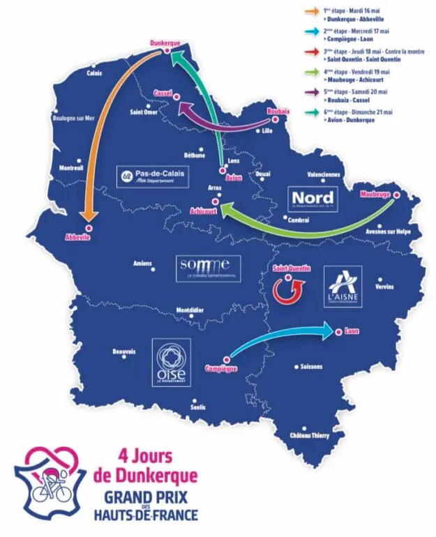Le détail du parcours : Le 16 mai ce sera une étape Dunkerque - Abbeville. Le 17 mai ce sera une étape Compiègne - Laon. Le 18 mai ce sera le contre-la-montre à Saint-Quentin. Le 19 mai ce sera une étape Maubeuge - Achicourt. Le 20 mai place à l'étape des Monts Roubaix - Cassel. Et pour finir, Avion - Dunkerque le dimanche. Un parcours sélectif, le vice-Président des 4 Jours de Dunkerque, Joël Huysman.